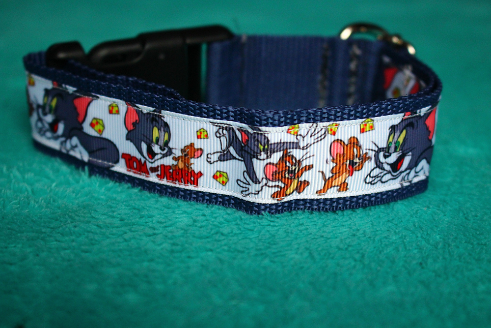 Oczywiście obroża Tom&Jerry dla Hugona, a Królewna Śnieżka dla Hery :) Obroże wykonane były z ozdobnej tasiemki naszytej na taśmę bazową. Obroże bardzo fajnie dobrana kolorystyczne, co prawda nie wybierałam tego ja ale na prawdę mi się spodobał :) Dla Huga wybraliśmy obroże o szerokości 2,5cm a dla Hery 3cm o ile się nie mylę - albo obydwoje mają po 3cm :D Obroże są u nas już prawie 3 miesiące - obydwie się bardzo dobrze sprawują. Do tej pory nie zniszczyły się - a czasem szarpią się po nich nawzajem. Jestem bardzo zadowolona z tego spontanicznego zakupu :) Jedynym minusem jaki się pojawił to to, że Hera już znacznie urosła od momentu kiedy zdjęcia były robione i zwyczajnie zatrzask jest dla niej za słaby - w momencie kiedy 15-kilogramowa Hera mocno pociągnie na smyczy lub lince to obroża się rozpina - po prostu dla niej zatrzaski są już za słabe :) A tak prezentują się w obrożach Hugo i Hera :)